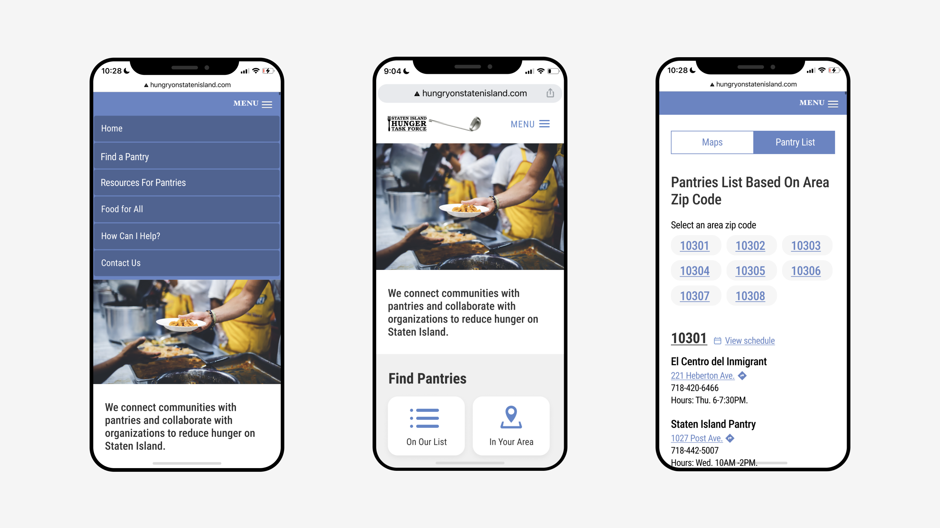 According to the Founder of SI Hunger Task Force, there are two main types of users on the site: 1) people who are looking for pantries; 2) organizations that are trying to donate food to help people in need. She also mentioned that the current site has two major methods for users to find suitable pantries: 1) through the pantry list; 2) through the Google maps. Additionally, they also implemented Google Calendar on the site to further help users locate pantries.