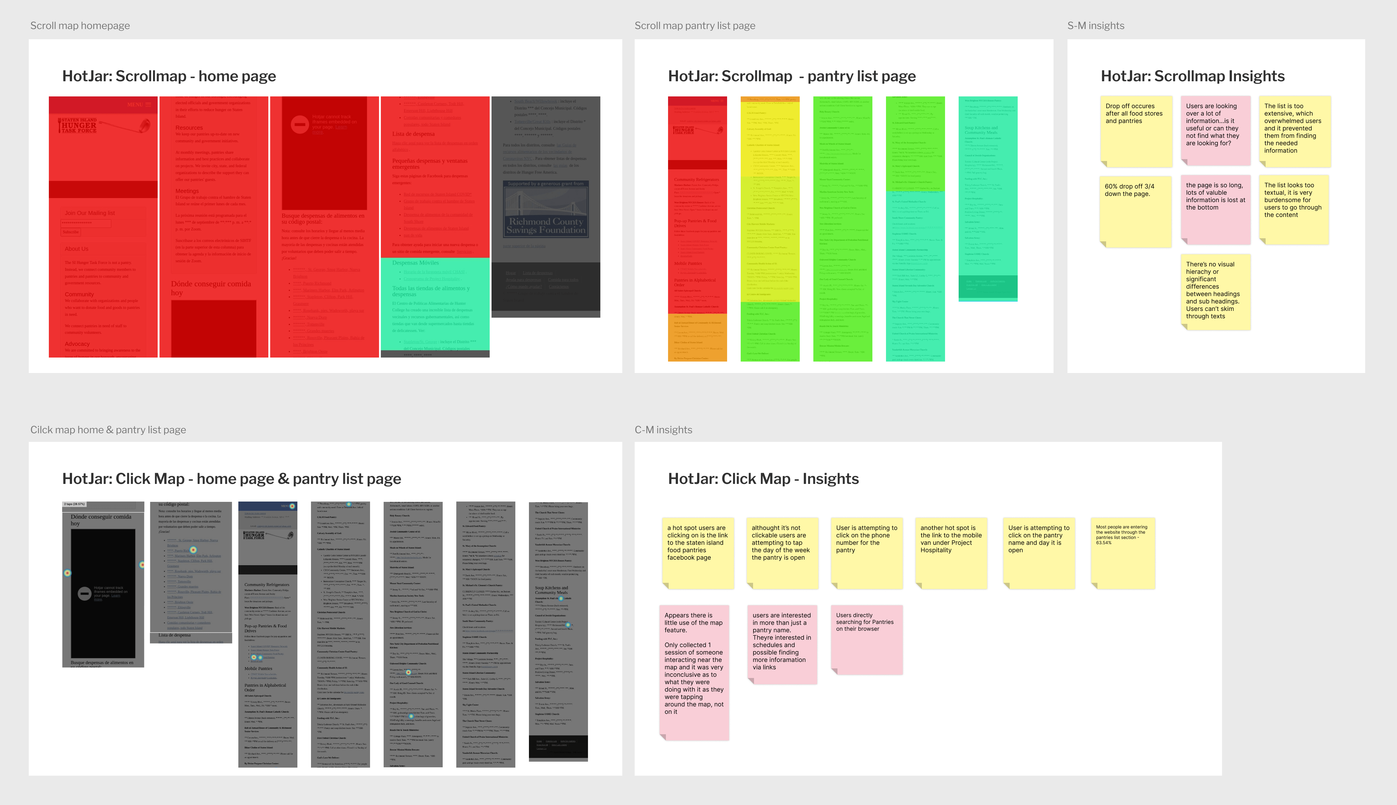 The heat maps indicate that there is a 60% drop off at 3/4 down the page. Which means, lots of valuable information is lost at the bottom. The click maps show that many users attempted to interact with the information provided for each pantry in the list.