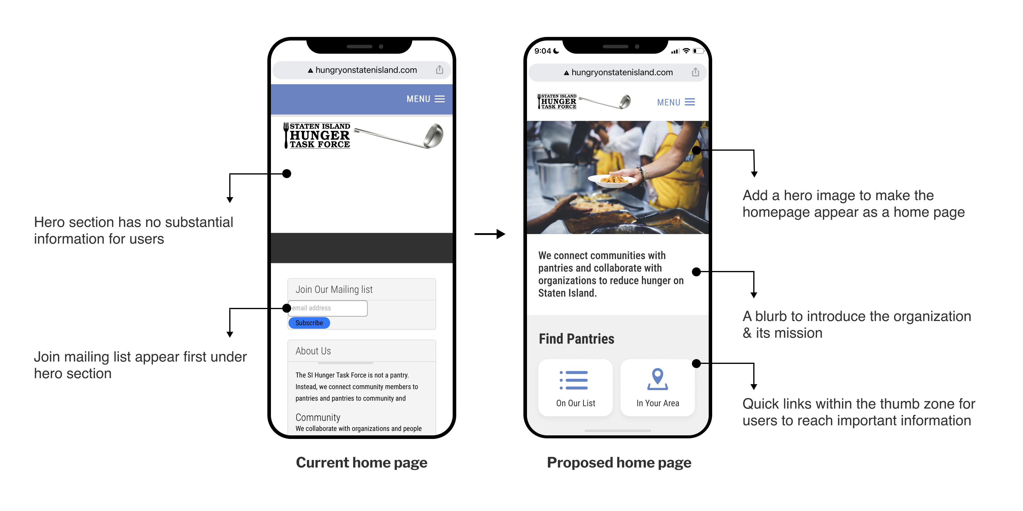 Hypothesis: Prioritizing the information on the home page above the fold will reduce confusion and help users locate pantry resources quickly.