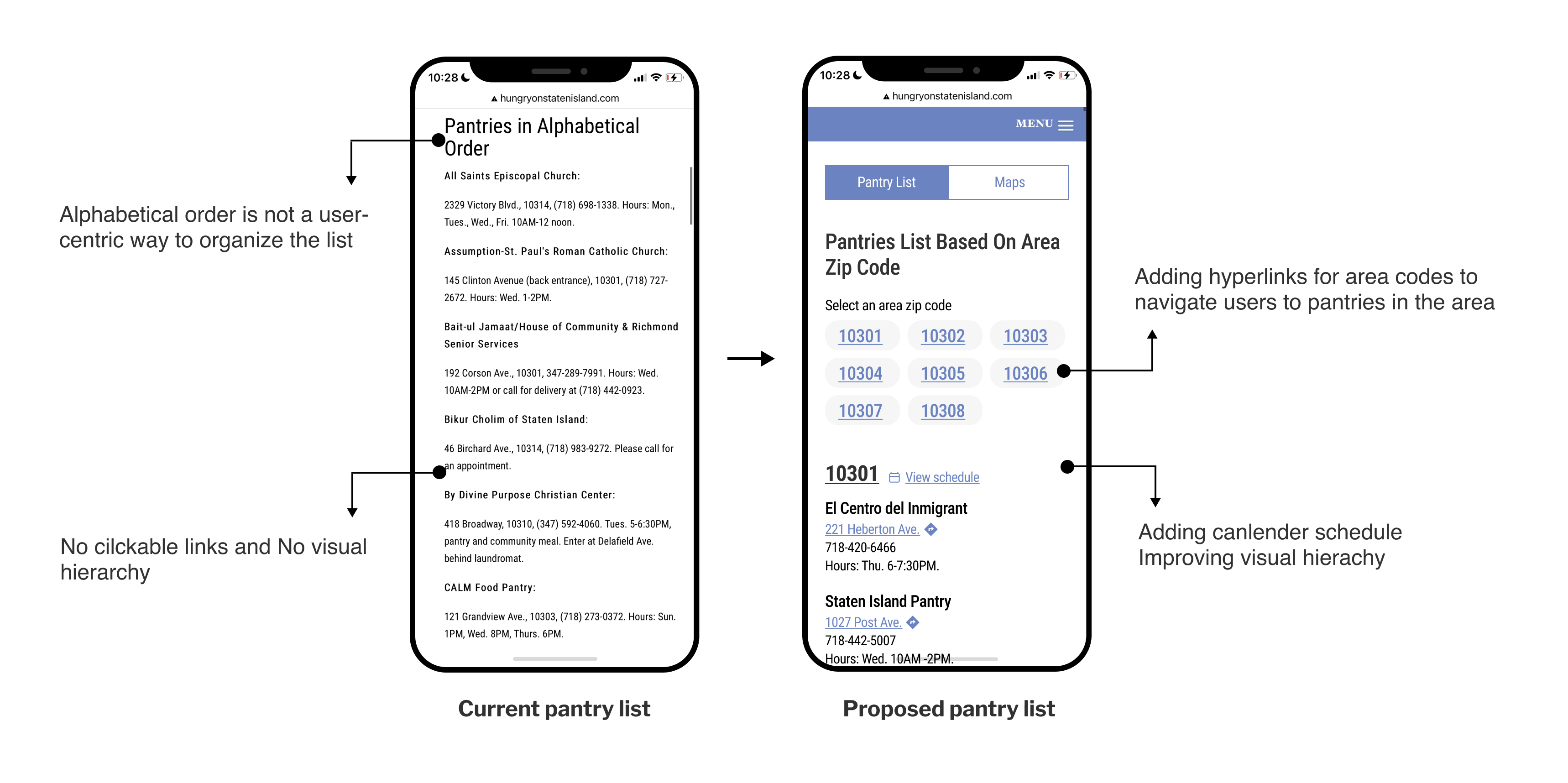 We recommend to rearrange the information on the pantry list based on users’ mental model. Therefore, we propose to list pantries based on area code. Additionally, we recommend adding hyperlinks for area codes that can take users directly to a list of pantries within the area.